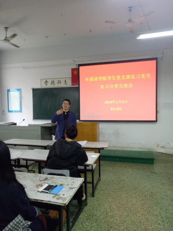 会上,陈化宇老师首先代表学生党支部委员会向全体党员汇报近半年的工作,包括各党支部的组织构成、学习贯彻党十九大精神情况、党员发展、党员教育培训、基层特色党建等方面,并对下一阶段的工作做了安排,希望全体同志不忘初心、牢记使命,在工作学习中发挥先锋模范作用。他说,党员实习分享会是乐竞(中国)一站式服务官网基层特色党建的重要环节,是对党员实习表现的一种考核,也为给同志们提供相互学习借鉴的机会。下学期初还要举行考研党员经验交流会,希望考研的同学能够取得好成绩,考上理想的大学。随后,实习的党员同志分享了实习的经验和感触。