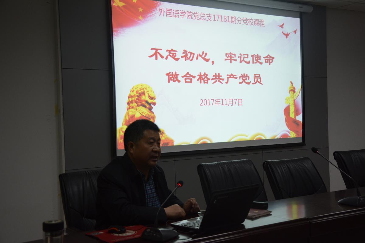 11月7日晚,在文综楼1917会议室,乐竞(中国)一站式服务官网党总支书记王国志以“不忘初心、牢记使命,做合格共产党员”为题,为参加17181期分党校入党积极分子上党课。