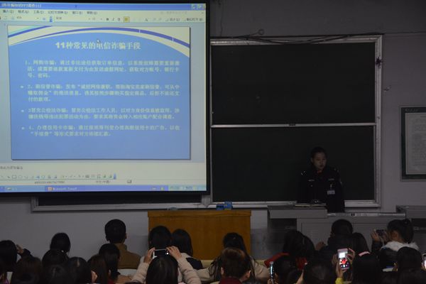程警官具体、详细地列举出常见的11种电信诈骗手段,并结合近期发生在校园里的真是案例,将其合并为五个部分给学生们具体讲解。学生们听得聚精会神,并与程警官积极互动交流。其中针对大学生的常见诈骗手段有:1.利用大学生急于挣钱,增加收入的心理,在网上以找兼职、办银行卡、购票等名义实施诈骗;2.慌称个人不幸博取同情实施诈骗;3.冒称金融部门工作人员实施诈骗。针对此类案件,程警官再三叮嘱大家,收到所谓执法机关,银行客户,购物网站的电话短信时,不要轻易相信,要根据电信部门提供的准确客服电话咨询核实。诈骗行为虽然千变万化,但是切莫贪小便宜,不要轻易相信短信承诺的利益。最后,程警官专门提到学生宿舍被盗的案例,并指出这类案件的主要作案方式以及学生应该如何做好防范。