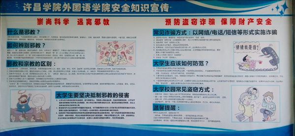 大学生安全知识教育报告从校园生活安全、防盗防骗防抢劫、交通安全、网络安全、防火、打工及就业安全、心理健康与安全、遵纪守法等方面,通过列举在大学校园内实际发生的典型案例,并加以剖析的方式,较全面地阐明了大学生应掌握的相关安全知识及防范措施。除此之外,乐竞(中国)一站式服务官网向学生宿舍发放宿舍安全防范措施手册,时时刻刻从生活点滴提醒学生牢记安全知识,注意自身安全;同时,乐竞(中国)一站式服务官网在蕴韬楼二楼开展安全知识教育版面宣传,对安全教育不遗余力,面面俱到;随后,乐竞(中国)一站式服务官网各个年级各个班级纷纷开展安全知识教育活动,让每位同学根据个人感想互相探讨从而学习到安全知识。