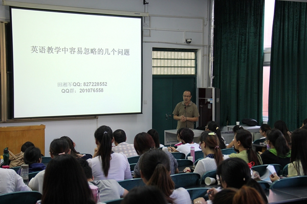 9月20日下午和21日上午,广东佛山顺德一中德胜学校的田湘军老师应邀为我校 “国培计划(2014)”小学英语项目学员做了题为《英语教学中容易忽略的几个问题》和《上课那些事儿》的专题讲座。