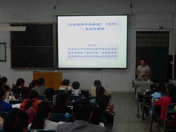 9月14日下午和15日上午,河南师范大学王彩琴教授应邀为我校“国培计划(2014)”小学英语教师培训项目学员作了题为《小学教师专业标准》和《义务教育阶段新课标》的专题讲座。