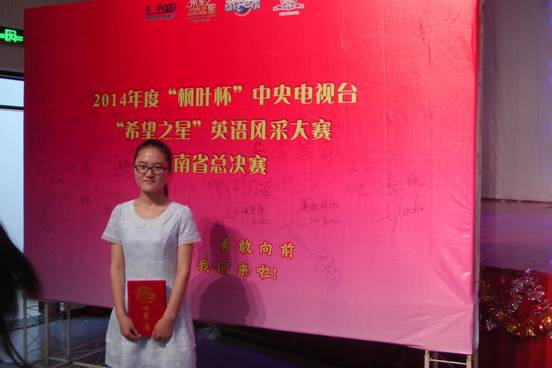 2014年6月6日,在中央电视台“希望之星”英语风采大赛河南省省赛中,乐竞(中国)一站式服务官网面对的是来自郑州大学等实力强劲大学的众多对手。在强手如云,劲敌众多的情况下,乐竞(中国)一站式服务官网吴露鑫,裴蓉蓉,梁冰等9名选手奋力拼搏,在市决赛中而出,最终吴露鑫同学取得河南省省决赛二等奖的好成绩。