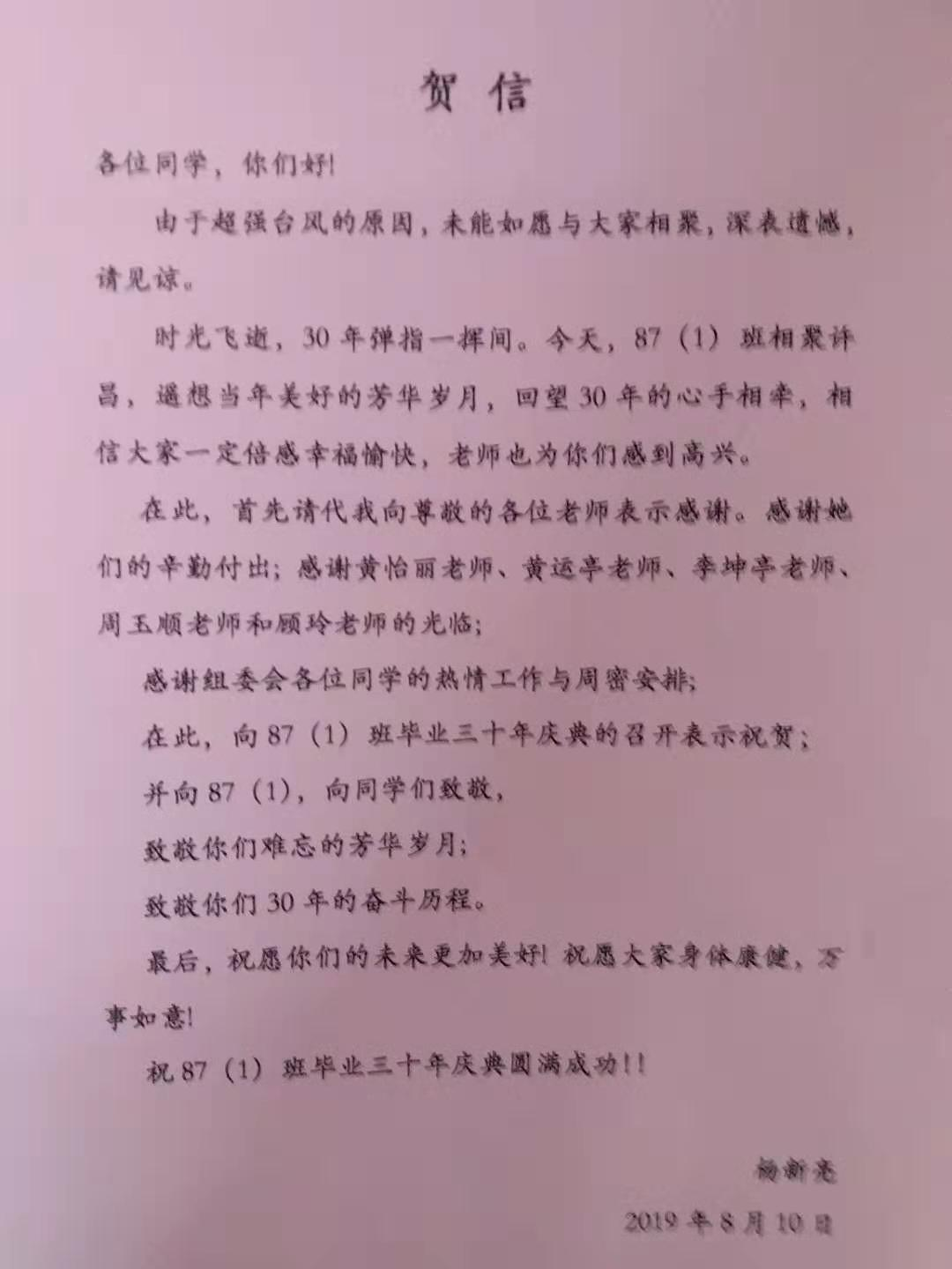 原许昌师专外语系主任、87(1)班主任、宁波大学大学外语部主任、书记、外院工会主席杨新亮老师发来贺信;原许昌师专外语系主任,现苏州维伯人力资源管理有限公司董事长崔万胜老师,原许昌师专外语系老师,现许昌学院乐竞院长刘彩霞教授、国际教育学院院长孟凡韶教授、宁波大学国际交流学院院长段汉武教授等也向庆典发来祝贺。
