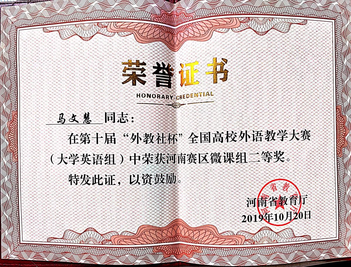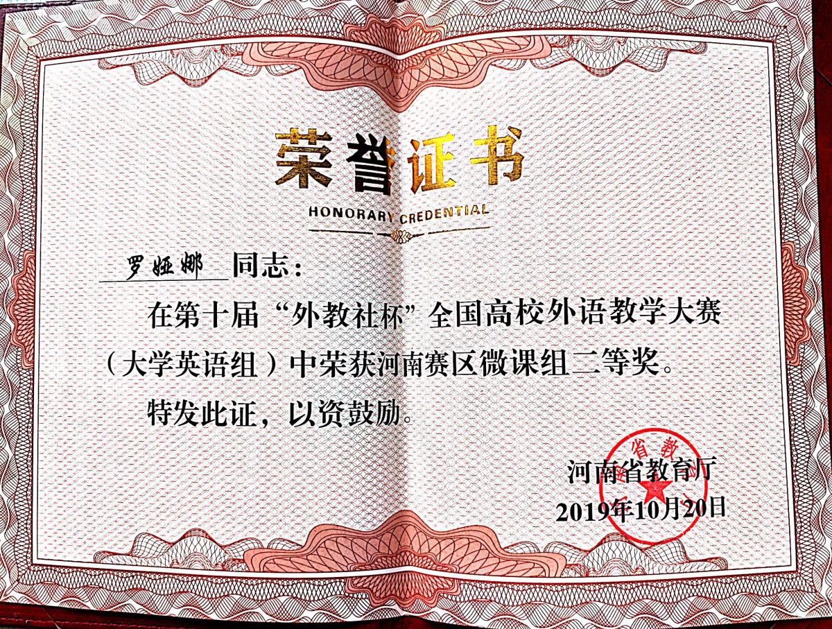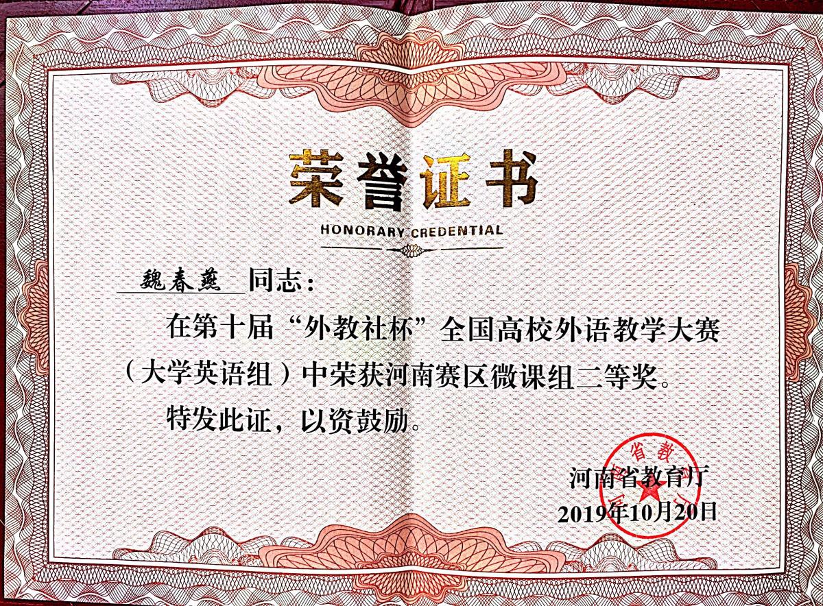 以河南省教育厅主办,上海外语教学出版社承办的2019年第十届全国高校外语教学大赛大学英语组河南省赛落下帷幕,乐竞(中国)一站式服务官网魏春燕、马文慧、罗娅娜老师的课作品获赛微课类二等奖。