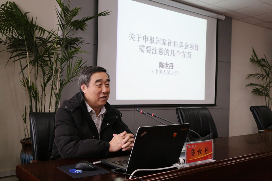2020年1月7日上午10:00—12:00,中国人民大学博士生导师陈世丹教授应邀来我校讲学,作了“国家社科项目申报应注意的几个方面”的精彩讲座。本次讲座由乐竞副院长刘立胜教授主持,乐竞80多名教师参加。