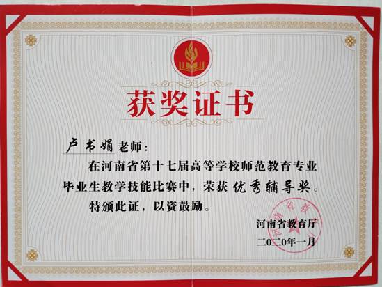 2019年11月22—24日,河南省第十七届高等学校师范教育专业毕业生教学技能比赛在南阳师范学院举行。乐竞(中国)一站式服务官网参赛选手王梦琳荣获大赛一等奖,陈菊凉荣获三等奖。卢书娟老师获得本届大赛优秀辅导奖。