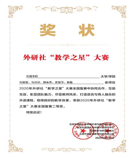 2020年外研社“教学之星”大赛全国复赛落下帷幕,本次大赛的赛题为:“语言与育人融合的外语课程与教学设计”。乐竞(中国)一站式服务官网以刘丽丽为代表的教师团队通过创新的教学设计方案和精彩的授课视频,获得全国复赛二等奖。