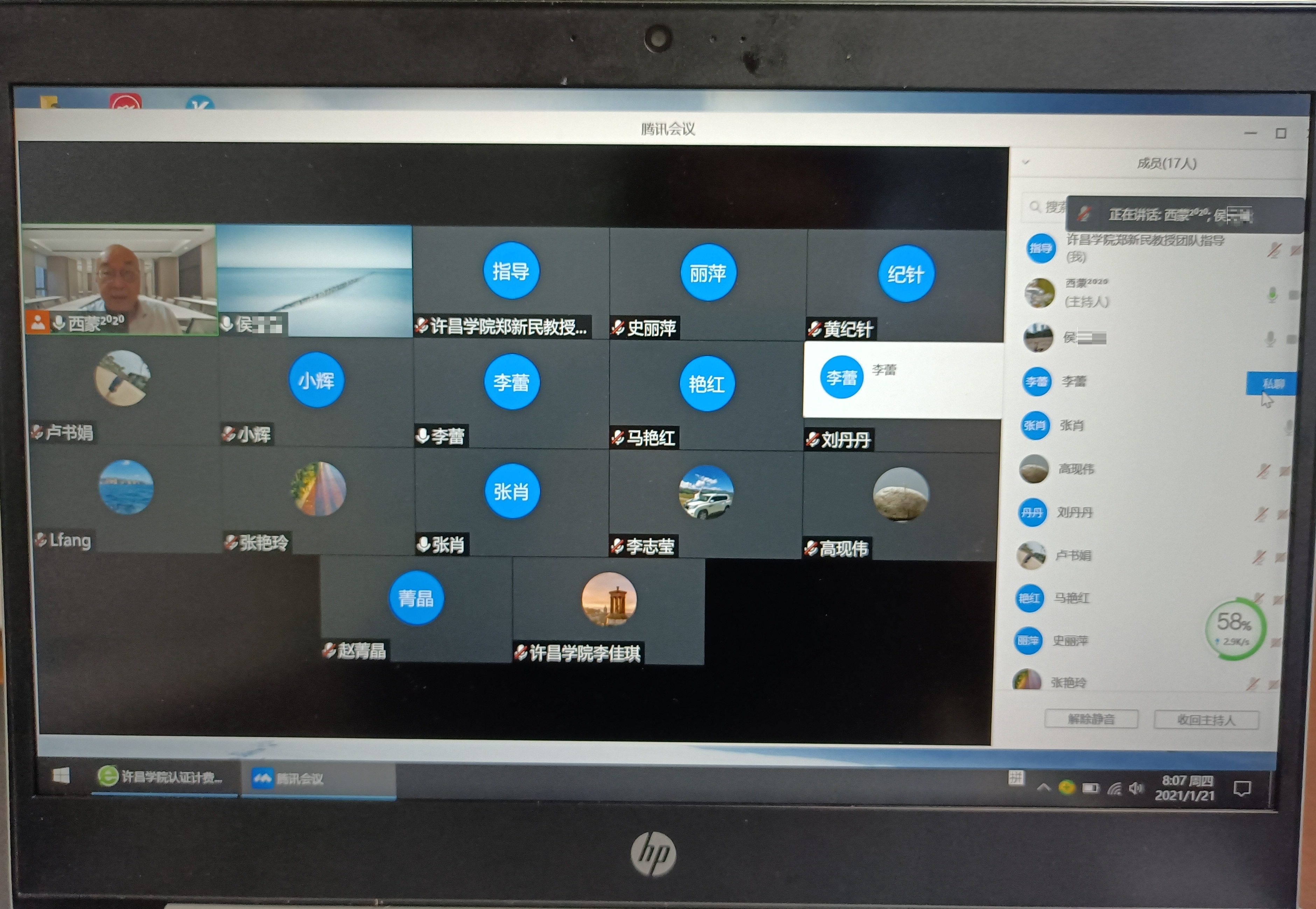 2021年1月21日上午,乐竞(中国)一站式服务官网兼职教授、上海外国语大学博士生导师郑新民教授及其指导的博士生侯老师通过腾讯会议平台对乐竞(中国)一站式服务官网学术团队成员进行在线指导。乐竞(中国)一站式服务官网参与本次指导的团队成员共有15位老师,会议由副院长刘立胜教授主持。