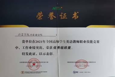 日前,由全国高等师范院校外语教学与研究协作组和国家基础教育实验中心主办的2021年全国高师学生英语教师职业技能竞赛决赛落下帷幕,乐竞(中国)一站式服务官网参赛选手在竞赛中取得佳绩,荣获二级一等奖2人,二等奖1人,三等奖3人,优胜奖6人;荣获一级一等奖2名,二等奖2名,三等奖3名,优胜奖6名。许昌学院外语学院获大赛优秀组织奖,张艳玲、谢静、卢书娟、刘丹丹等7位教师获得本届大赛优秀辅导奖。