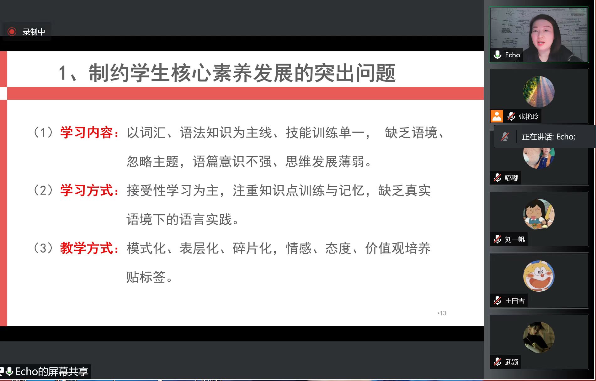 2022年5月20日晚上19:00点,许昌市教研室初中英语教研员涂砚清老师应邀在线上为2019级英语专业和2021级英语专升本学生做了题为“基于核心素养的英语课堂教学”的讲座。涂艳清老师身兼许昌市初中和小学英语教研员,主持多项省、市级课题,发表论文多篇,并多次指导教师在省市优质课比赛中获奖。在两个多小时的讲座中,涂老师对英语学科核心素养的内涵进行了解读,阐释了教学活动观与落实英语核心素养的关系,并通过具体案例分析展示了核心素养培养的具体方法和途径。在对初三英语模考试卷分析的基础上,点明了英语课堂教学改革的方向。最后通过一堂优秀的英语写作课例呈现了如何在英语课堂上实施学生核心素养的培养。涂老师的讲座内容丰富,围绕当前英语教学改革的核心问题进行了探讨,给学生们很大的启发和帮助。(图片由张艳玲提供)