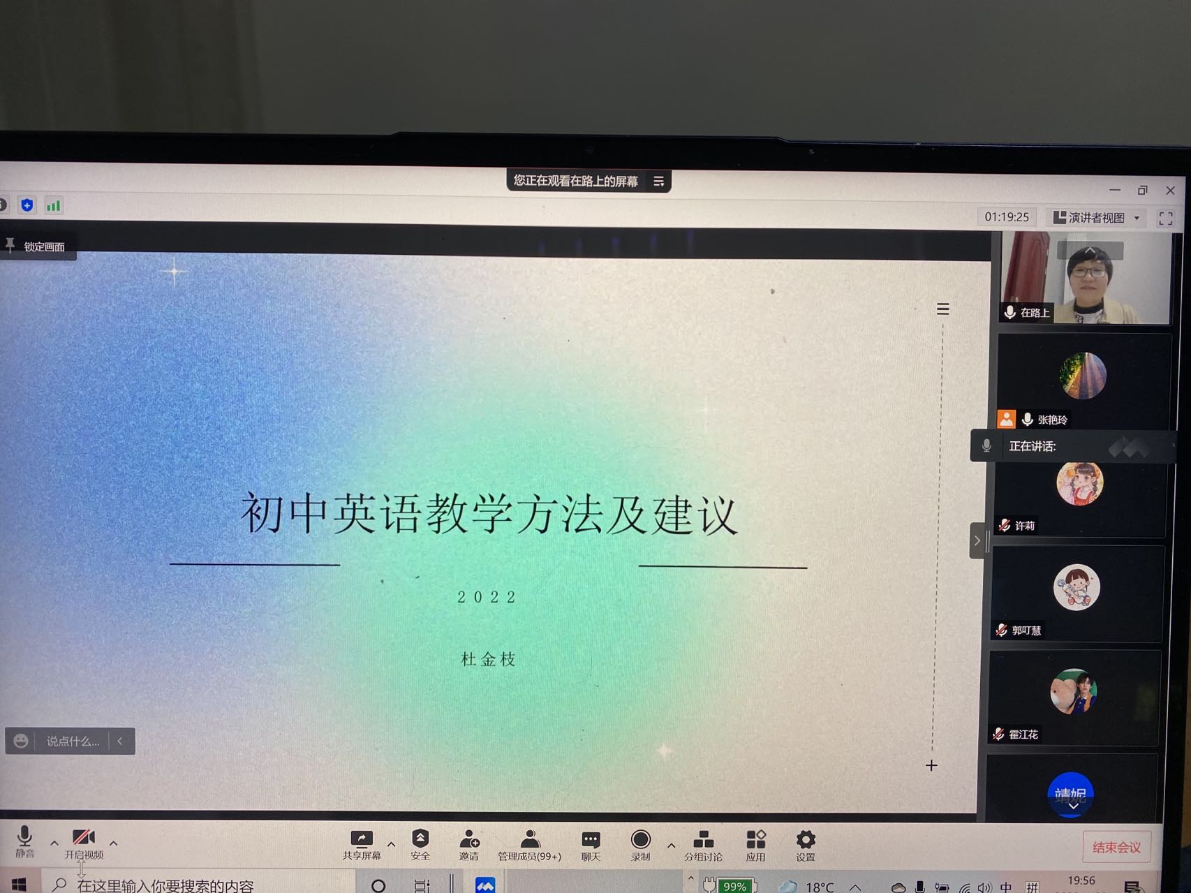 2022年4月29日晚上19:00点,焦作市孟州市会昌中心学校杜金枝老师应邀在线上为2019级英语专业和2021级英语专升本学生举办了一场题为“初中英语教学方法及建议”的讲座。杜金枝老师是孟州市会昌中心学校的高级英语教师。多年来一直从事初三英语教学,具有丰富的教学经验。任教期间曾多次获得焦作市以及孟州市优质课一等奖,河南省青年教师辅导一等奖,并多次担任三门峡、洛阳等地的招教与职称评定工作。29日晚上,杜金枝老师首先就人教版英语教材的特点、体系结构等做了详细的分析,随后对听说读写以及语音、词汇等语言知识的教学给出了具体可行的教学建议。在反思农村中学英语教学的困境基础上,杜老师就自己总结提炼出的单元整体教学模式给学生们做了详细的阐释,为提高英语课堂教学的有效性,提高学生的学习兴趣和主动性提供了新思路、新方法。本次讲座也使同学们认识到一位优秀的英语教师不仅要掌握扎实的专业知识和娴熟的教学技能,更要能不断反思,做一名研究型教师。(图片提供:张艳玲)
