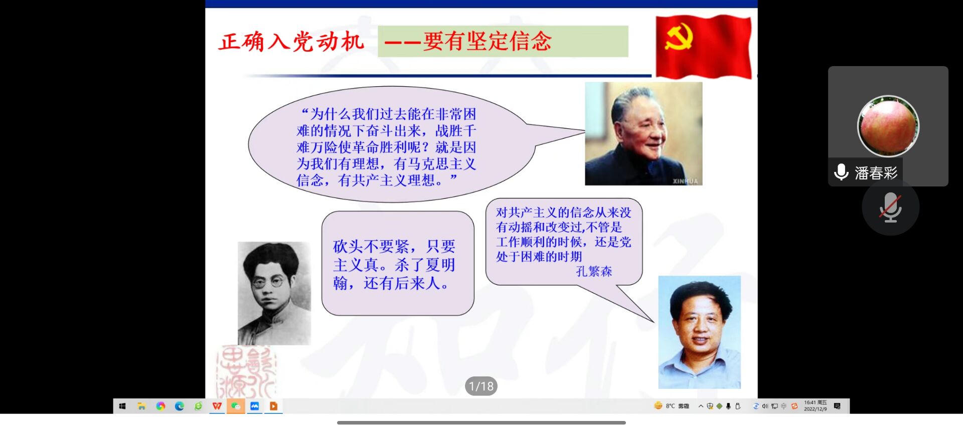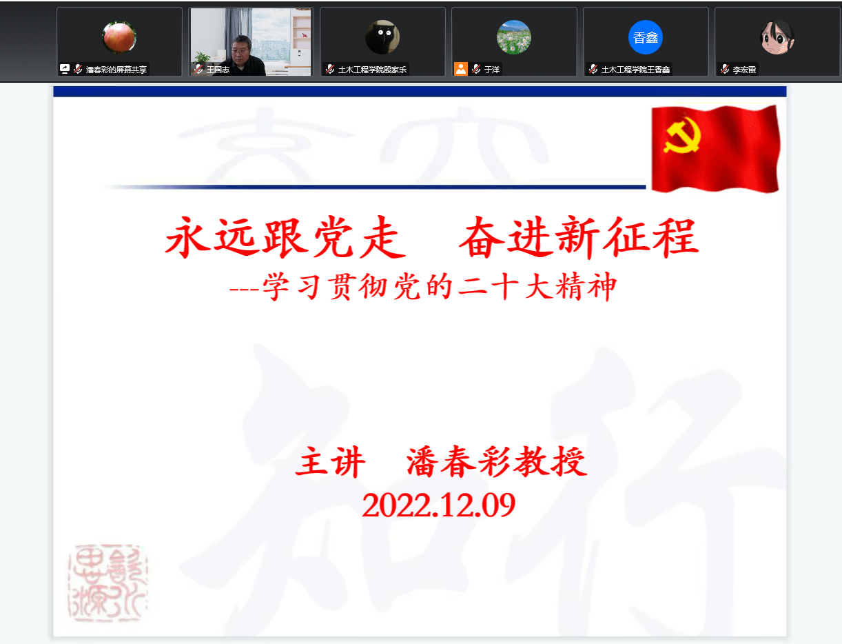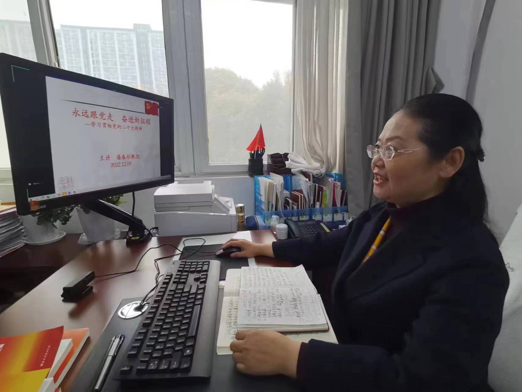 为深入学习宣传贯彻党的二十大精神,提升入党积极分子的政治觉悟和理论素养,12月9日下午,乐竞(中国)一站式服务官网邀请许昌学院副校长潘春彩教授以线上会议的形式为乐竞(中国)一站式服务官网积极分子上党课。乐竞党委书记王国志、学生党支部书记李钧及部分预备党员共同聆听。