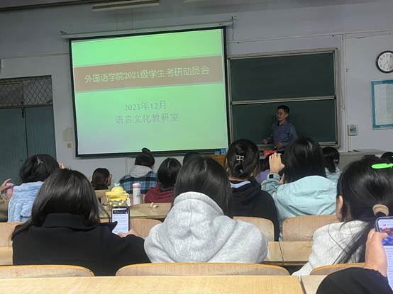 2023年12月7日晚上七点乐竞(中国)一站式服务官网在B合二十教室成功举办了2021级英语类专业学生考研动员会。本次动员会由乐竞语言文化教研室主办。该活动旨在促进21级同学们加深在择校、选择专业等方面的理解,以更好地准备考研。乐竞(中国)一站式服务官网温军超老师和近200名2021级同学一起参加本次了动员会。