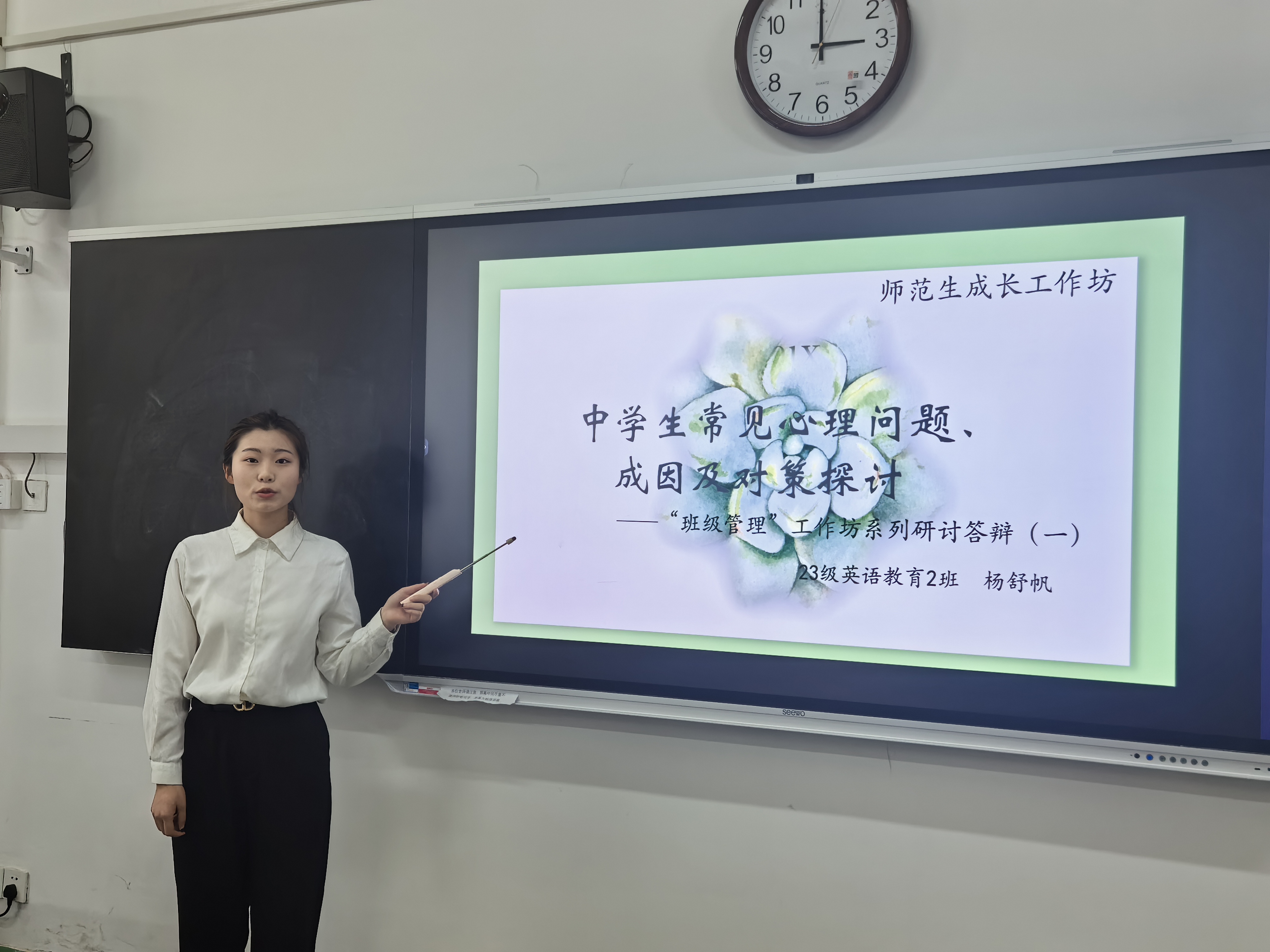 为进一步提升师范生对中学班级管理的科学认知,2025年3月24日至4月2日期间,乐竞“班级管理工作坊” 在23级英语教育专业学员中开展了首轮研讨答辩活动。