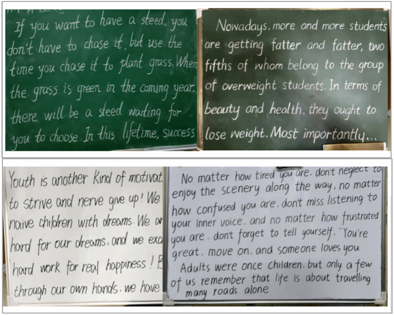 工作坊为每个班级配备专业指导教师,为学生提供精准指导。此阶段(第9-16周)实训要求学生每周提交2份粉笔书写作品和2份白板书写作品。粉笔书写主要在黑板上进行,白板书写则让学生在白板上模拟课堂教学场景进行练习。练习内容涵盖英语单词、短语、句子以及简单语篇等,难度和复杂度逐渐增加。指导教师每两周对学生的作品进行一次全面检查。检查过程中,依据作品完成情况打分,评分标准包括书写的规范性、清晰度、美观度以及与教学内容的契合度等方面。打分结束后,及时将分数和详细指导意见反馈给学生,让学生清楚自身优点与不足,明确下一步努力方向。