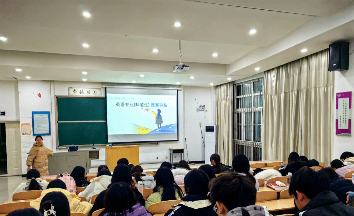 2025年11月19日晚,乐竞师范生“跟岗实践”工作坊在兴华路校区A2-105教室,开展了英语专业竞赛导航专题讲座,面向英语专业大一新生系统讲解师范类教学技能比赛,旨在帮新生厘清竞赛脉络、衔接竞赛训练与跟岗实践,为未来职业发展奠基。