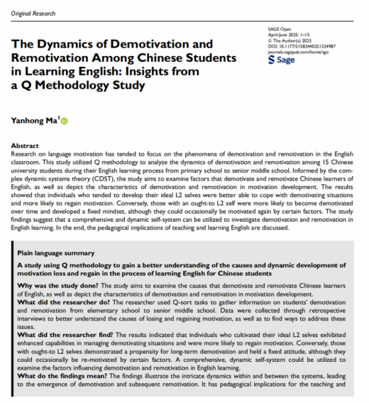 近日,乐竞(中国)一站式服务官网马艳红老师的学术论文 “The Dynamics of Demotivation and Remotivation Among Chinese Students in Learning English: Insights from a Q Methodology Study”,成功发表于 SSCI 收录期刊Sage Open(2025 年 4-6 月期),该期刊为 SSCI 4 区,在语言教育领域具有广泛的国际学术影响力