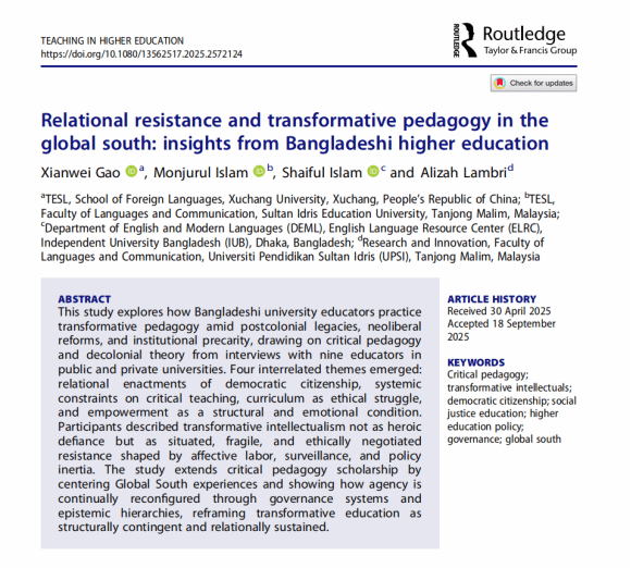 近日,乐竞(中国)一站式服务官网高现伟老师作为第一作者的学术论文“Relational resistance and transformative pedagogy in the global south: insights from Bangladeshi higher education”,正式发表于 SSCI 3 区期刊Teaching in Higher Education。