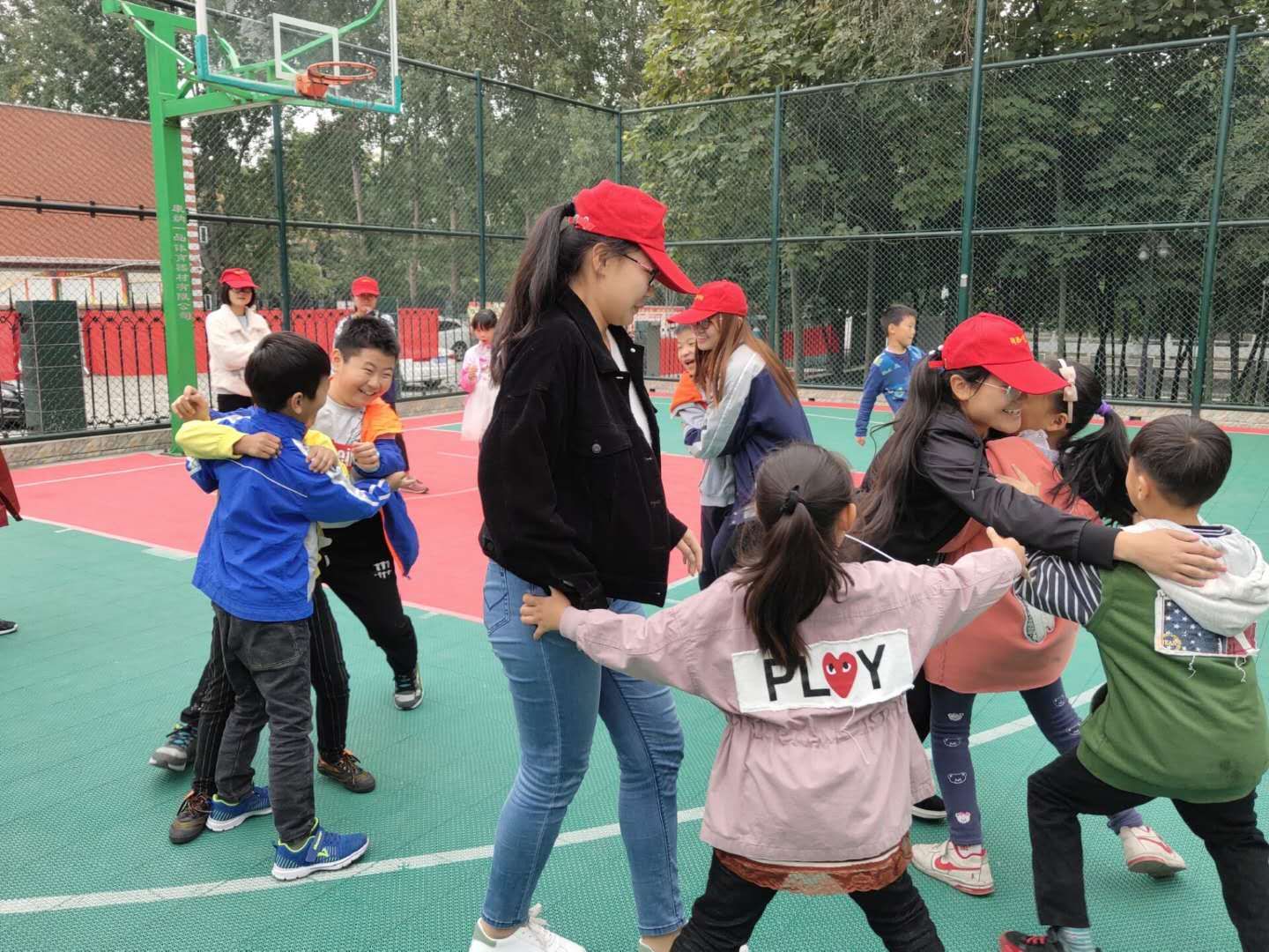 时间如水,涛涛奔流。课间休息时间到了,孩子们拿上自己的玩具跑向篮球场,有模有样的拍打着篮球。志愿者在孩子旁边陪伴,与他们一起嬉戏打闹,快乐的玩耍。庭院中一些较小的孩子们在玩耍,其中有个小女孩在玩呼啦圈。呼啦圈在她身上转啊转,此时此刻,她仿佛是一位快乐的小天使,笑容洋溢在脸上。突然小女孩跌倒了,志愿者赶紧跑过去抱起她并安慰她,她好像听进了志愿者的劝说。她不再哭泣,重新拾起呼啦圈,愉快的玩耍。