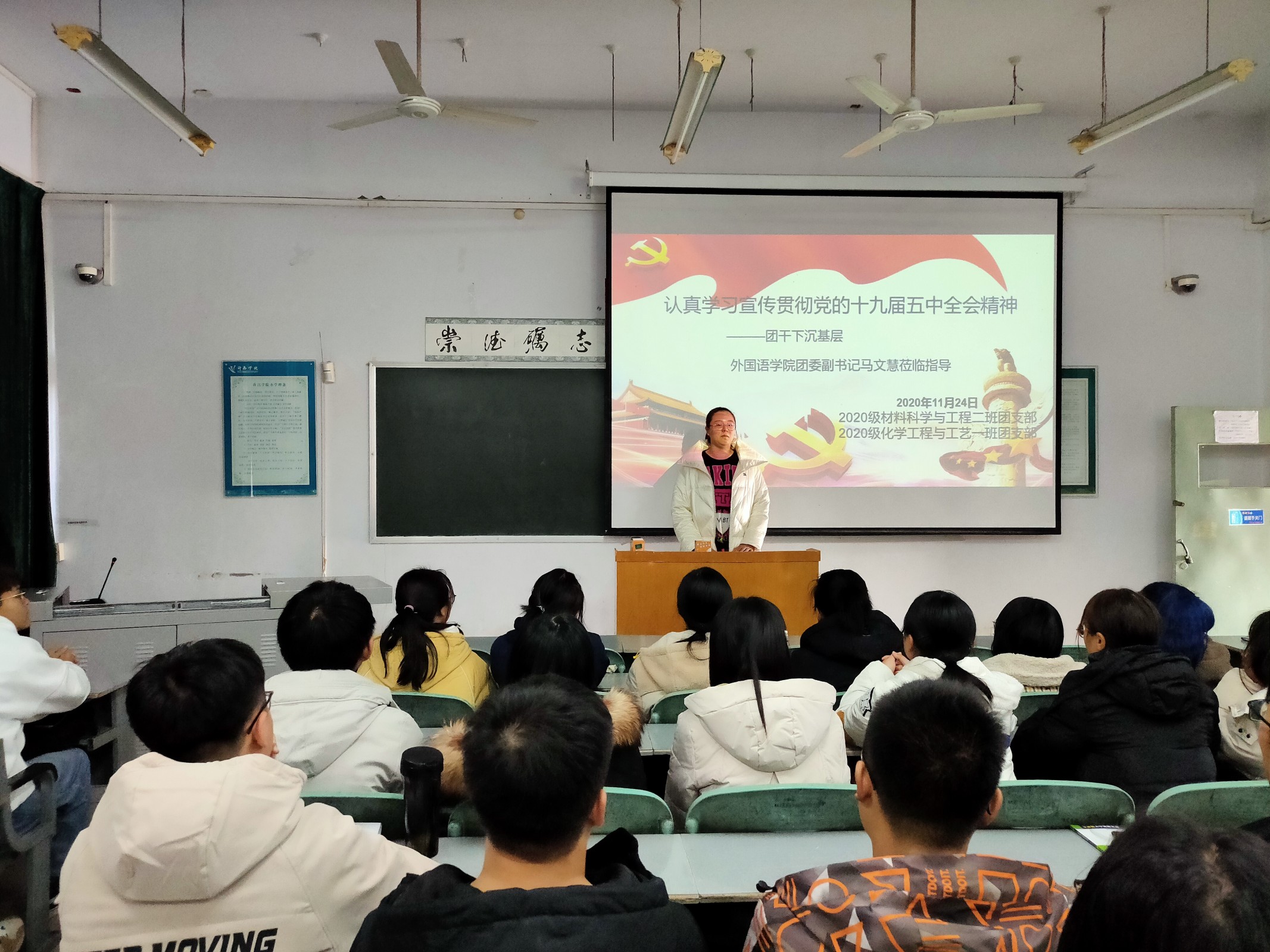 为认真贯彻学习党的十九届五中全会精神,加强共青团团干队伍建设,使团组织起到“带头靠前学,带动广泛学”的榜样模范作用,2020年11月24日乐竞团委副书记马文慧为化工与材料学院“团干部下沉基层”的联点团支部2020级材料科学与工程二班团支部以及化学工程与工艺团支部的学生们在C-106教室举行了第二次“团干下沉基层”组织活动。此外,参加本次会议的还有乐竞团委学生副书记刘博伟和化工与材料学院团委学生副书记李奉蔚。