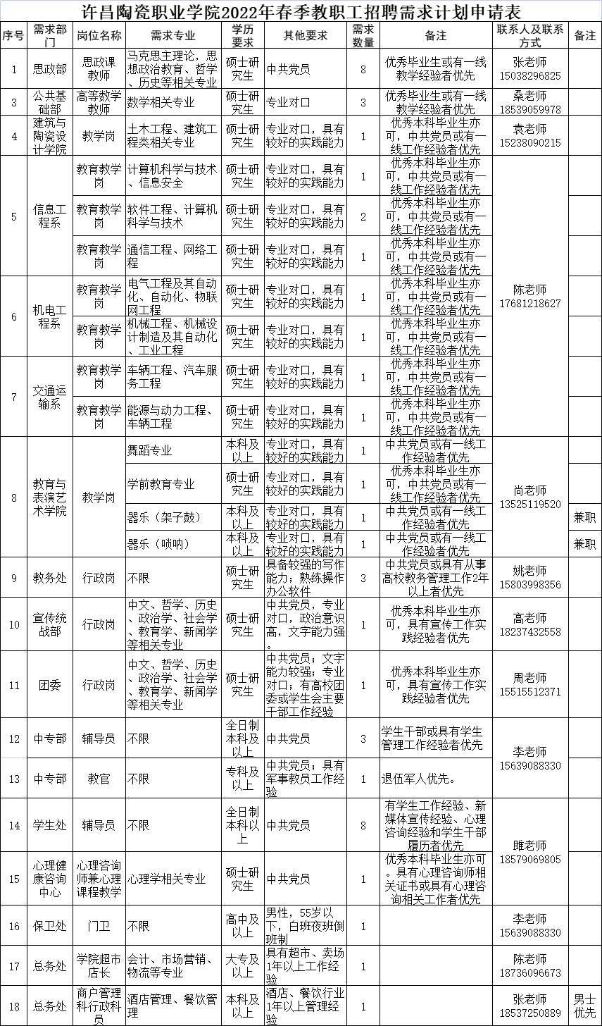 招聘岗位及相关要求详见许昌陶瓷职业学院2022年人才招聘计划表(附件1)。