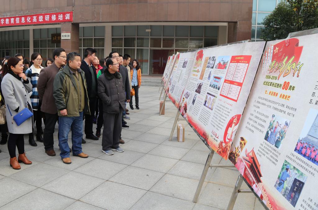 党总支书记王国志带领大家认真观看图片内容,感受光辉业绩,接受革命主义教育。他说,长征图片展是爱国主义教育的生动教材,让同志们深深感受中国共产党人坚定的理想信念,党领导的人民军队不怕牺牲、勇往直前的精神。王书记要求同志们要认真贯彻习近平总书记在纪念长征胜利80周年大会上的讲话精神,要“弘扬伟大长征精神,走好今天的长征路,必须坚定共产主义远大理想和中国特色社会主义共同理想,为崇高理想信念而矢志奋斗”;要在体验红军长征路上的艰辛与困难的同时,不忘作为共产党员的初心,坚持和发扬党的优良传统,继续深入开展“两学一做”学习教育,奋发图强、做好本职工作,做一个合格的党员,为学院未来发展的新长征作出自身应有的贡献。