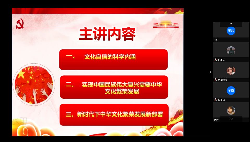 2020年4月8日,乐竞于线上开展了以“坚定文化自信,繁荣发展社会主义先进文化”为主题的入党积极分子培训课。此次党课由滕卫双老师采用网络直播的形式讲解,带领大家全面而深刻地了解了文化、文化自信以及其巨大的作用和影响力。中国特色社会主义文化源于中华民族五千年文明历史所孕育的中华优秀传统文化,熔铸于党领导人民在革命、建设改造中创造的革命文化和社会主义先进文化。告诫积极分子必须严格要求自己,跟随着党的步伐,不断学习新知识,努力将中华民族优秀传统文化发扬光大,促进祖国的繁荣发展。