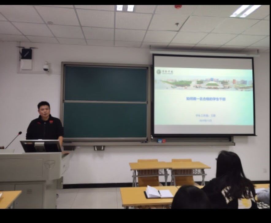 王老师从最基础的“学生干部的定义”讲起,强调了学习对于学生干部的重要意义。接着王老师又从“学生干部应具备的基本素质和能力”讲起,强调学生干部应具有正直、谦虚和低调的思想道德素质的同时也要有管理、表达、收集处理信息、社会交往、团队协作、知人善任、开拓创新以及无私奉献的能力,王老师通过一个个鲜活的事例来说明学生干部应具备这些素质与能力的重要性。