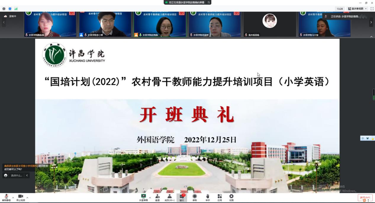 12月25日上午,许昌学院乐竞以线上方式举行“国培计划(2022)”农村骨干教师能力提升培训项目—市级、县级骨干教师(小学英语)培训班开班典礼。国培管理团队全体成员与百名学员相聚云端,参加了此次开班仪式。乐竞副院长刘立胜教授出席开班典礼并致辞,国培项目秘书赵菁晶主持了此次活动。