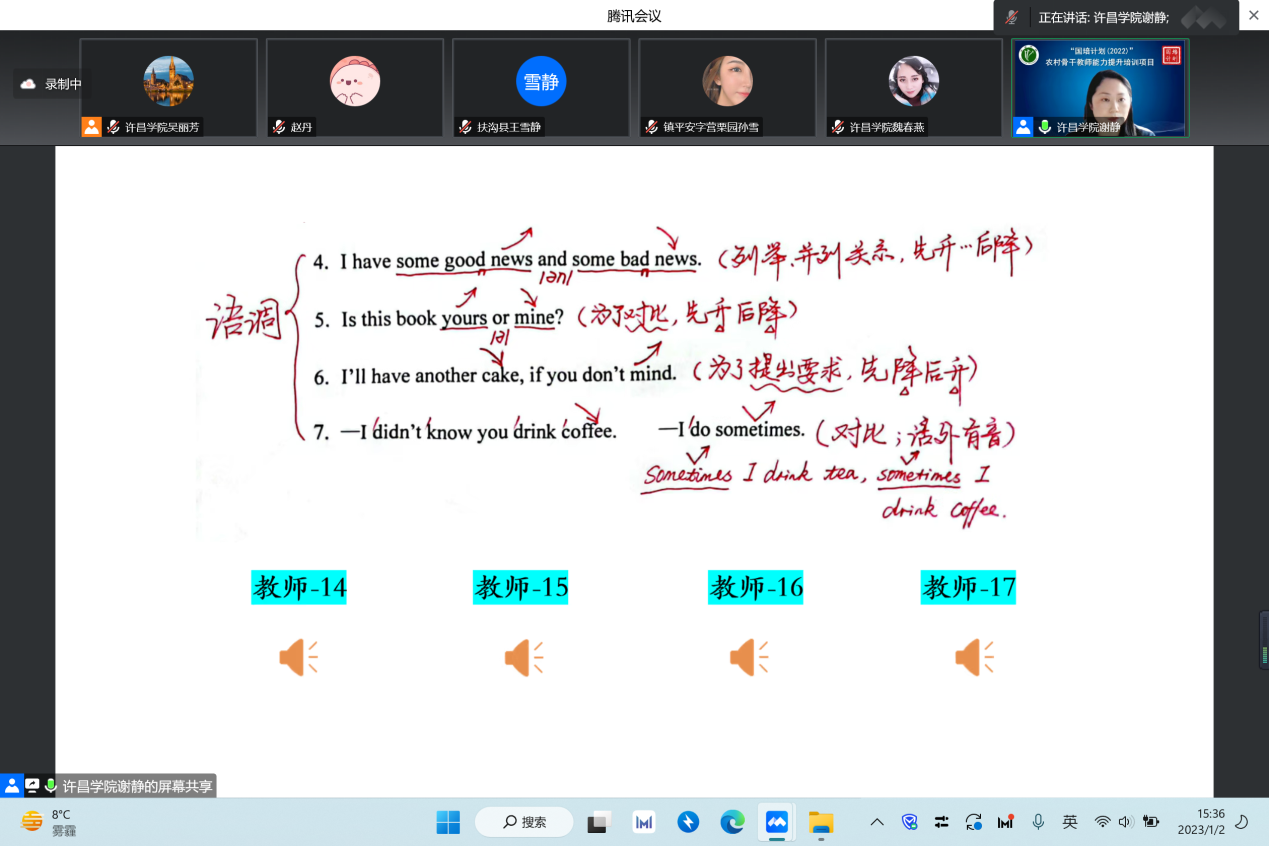 2023年1月2日下午,英语语音比赛与指导活动在线上成功举办。许昌学院乐竞谢静副教授就前期在参训学员中开展的英语语音比赛活动进行了反馈指导,“国培计划(2022)”小学英语市级骨干教师培训班的学员参加了此次活动。